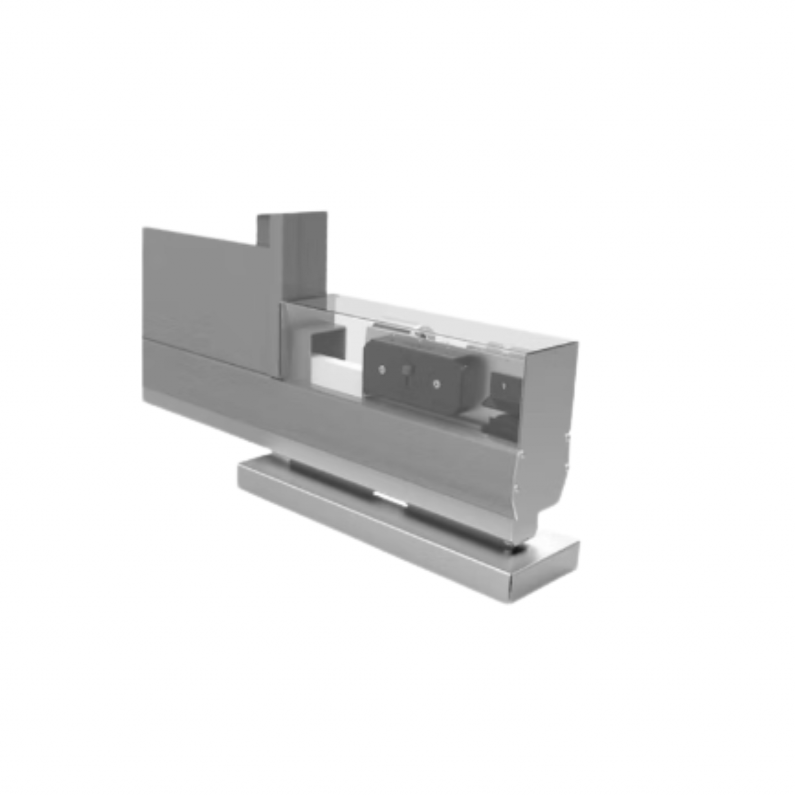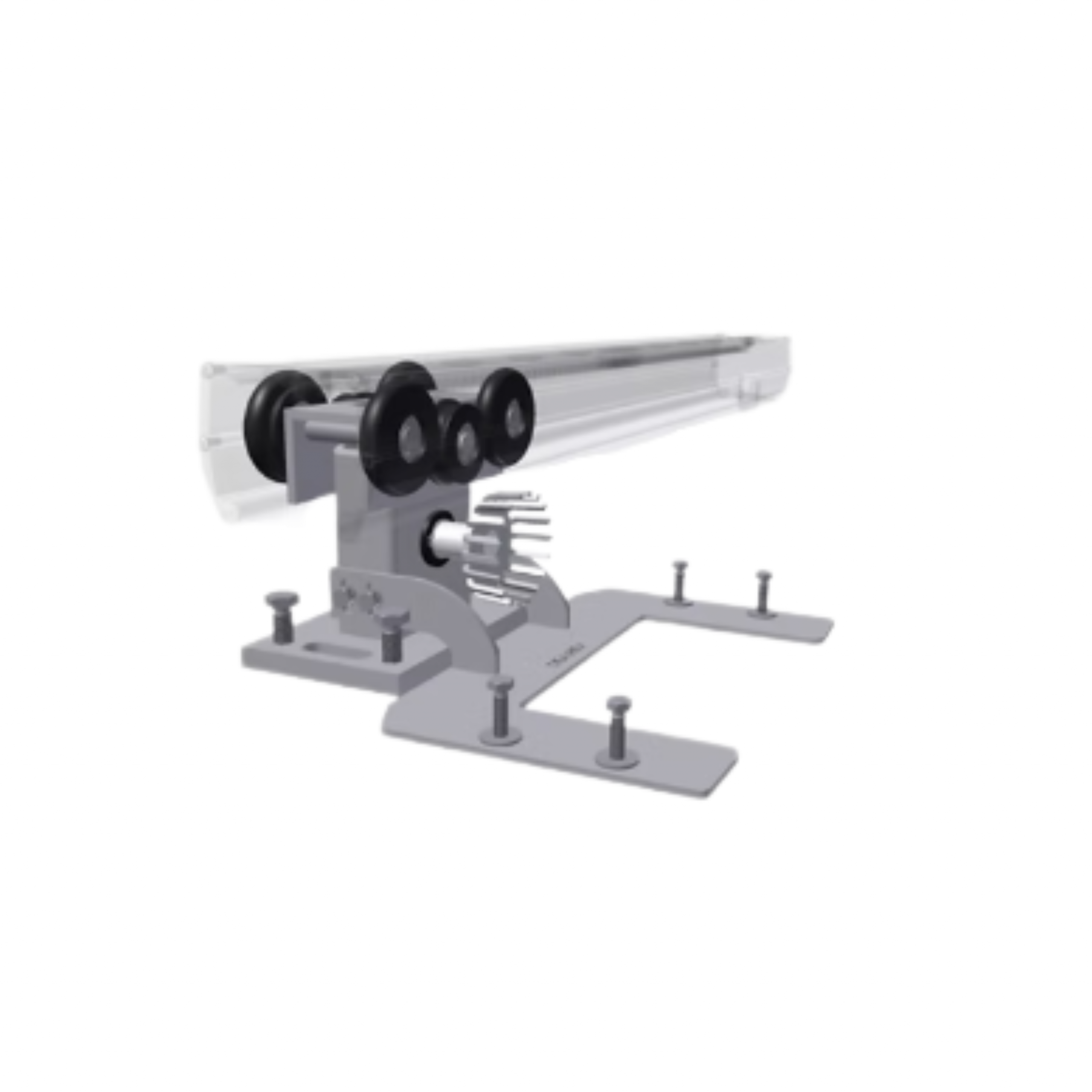 Der Getrieberollenbock nimmt die Kraft vom Antriebsritzel über ein Kupplungsstück auf und übertragt diese mittels einem Getriebe auf die im Laufrollenprofil eingeschobene Zahnstange. Die Zahnstange ist damit unsichtbar. Der Motor kann ohne weitere Ausrichtung direkt auf der Antriebskonsole montiert werden.